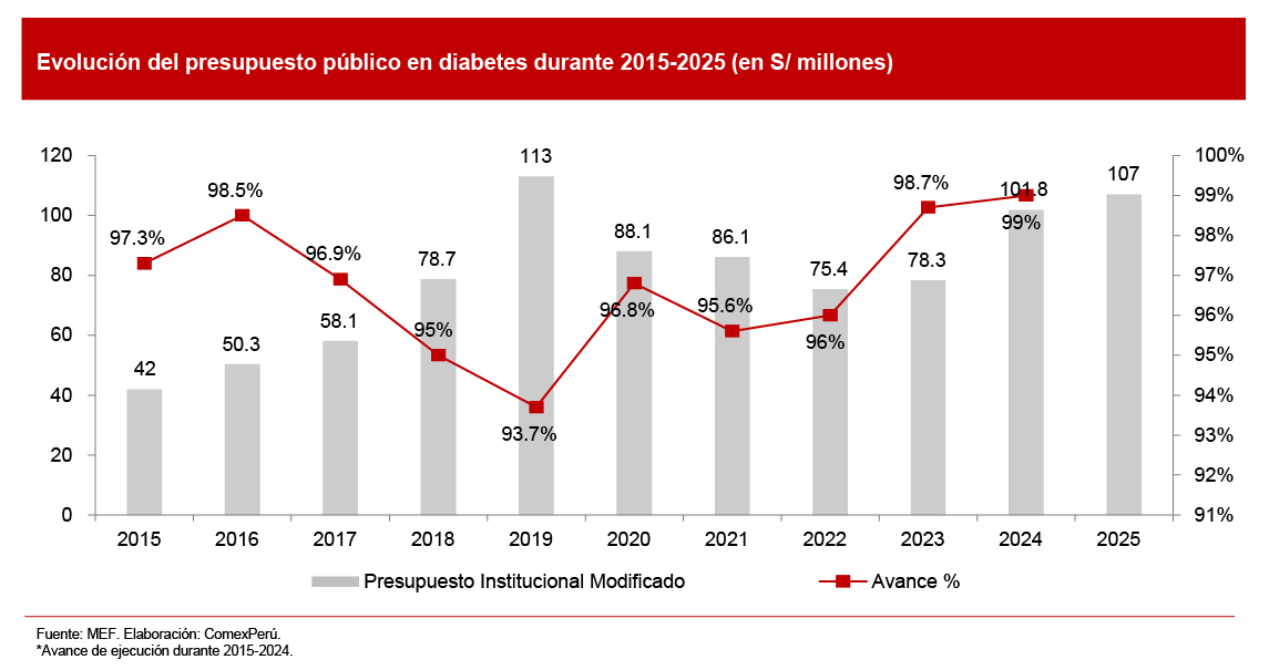 En la última década, el presupuesto público destinado al tratamiento y control de personas con diabetes ha mostrado un crecimiento sostenido, lo que refleja una mayor asignación de recursos para atender una enfermedad crónica en expansión. Desde 2015, los recursos asignados a esta partida han más que duplicado su monto y mantenido niveles de ejecución superiores al 95% en la mayoría de los años. Este incremento evidencia una mayor priorización dentro de la función salud, aunque todavía representa una fracción pequeña del gasto total del sector.