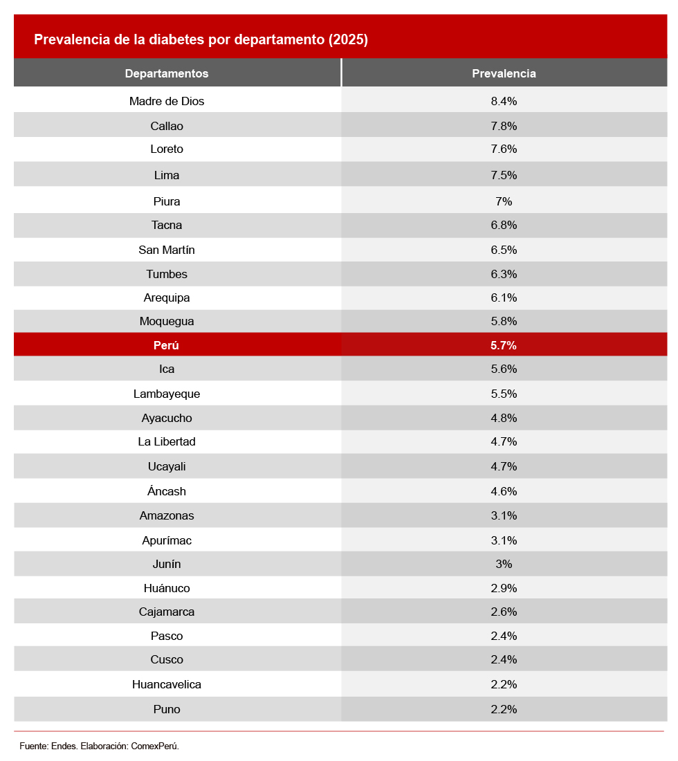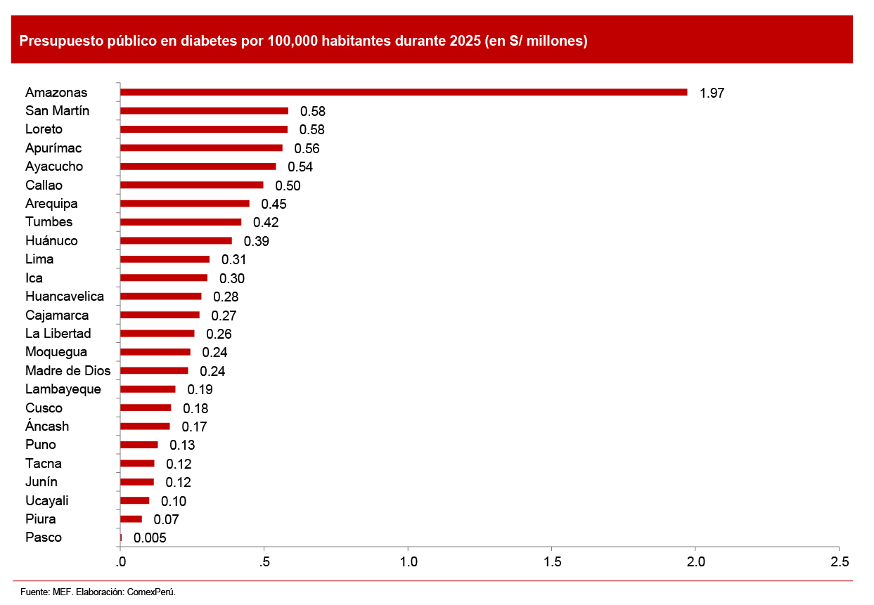 Estas cifras evidencian que el país enfrenta un doble desafío: fortalecer la detección temprana de la enfermedad y reducir las desigualdades territoriales en el acceso a un tratamiento continuo y de calidad, factores esenciales para evitar el aumento de casos y los altos costos asociados a las complicaciones crónicas. En ese contexto, destacan situaciones como la de Madre de Dios que, pese a presentar una de las prevalencias más elevadas del país, recibe un nivel de gasto público por habitante inferior al de otras regiones con menor incidencia. Este contraste refuerza la necesidad de alinear las asignaciones presupuestales con la carga real de enfermedad, para evitar brechas que limiten la capacidad de respuesta del sistema de salud en los territorios más vulnerables.