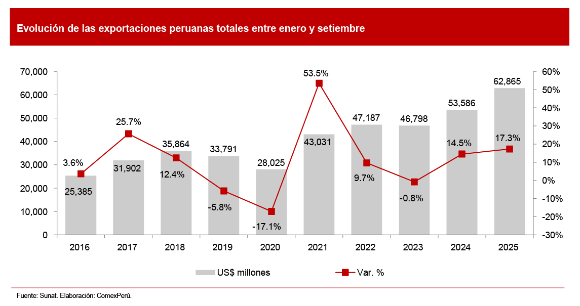 Las exportaciones peruanas sumaron US$ 62,865 millones entre enero y setiembre de 2025, lo que significó un crecimiento del 17.3% con respecto al mismo periodo del año anterior, según cifras de la Sunat.